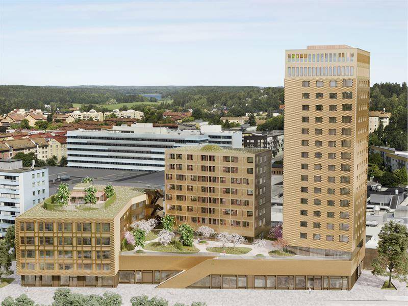 Kommunen ville ha ett högt, innovativt hus som syns från E4:an. Huset kommer bli 69,7 meter högt för att inte störa inflygningen till Arlanda. Fasaden kommer skifta i guldtoner beroende på hur solen står samt vilken tid på dygnet det är. Utöver detta tillkommer två lägre huskroppar som utgör vårdboendet samt bostadsrätter för personer över 55 år. Det guldfärgade huset kommer att bli hyresrätter då det efter en analys kom fram till att kommunen behövde fler av den typen boende. Att det mest spektakulära huset blir just hyresrätter ser vi som innovativt vilket är ett ledord i vår verksamhet.