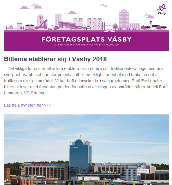 I det här numret kan du läsa om en stor kommande etablering i Väsby, hur arbetet med Väsby Entré fortskrider, om Upplands Väsby kommuns nya miljöchef och miljöstrateg samt se hur Väsby Promotion under året arbetat med skolan och vilka aktiviteter som du framöver har möjlighet att delta i. Läs hela numret här!